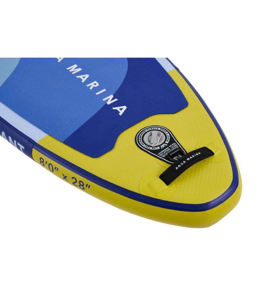 Con tecnología Drop Stitch súper liviana, con materiales de calidad, aleta central deslizable extraíble, cordón elástico integrado de fácil ajuste suministrado para almacenamiento en cubierta, remo ligero especialmente diseñado para junior ryders y bomba de doble acción Aqua Marina para un inflado rápido y fácil.